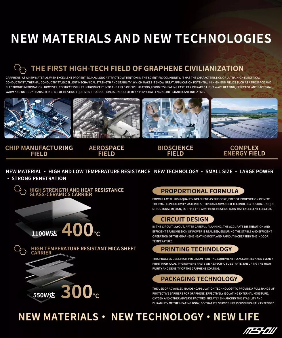 Ως κορυφαίος κατασκευαστής έξυπνων κατοικιών στην Κίνα, η Meshow εμπλέκεται βαθιά στην έρευνα και την ανάπτυξη αποτελεσματικού εξοπλισμού θέρμανσης και εξοικονόμησης ενέργειας. Η μαύρη φορητή θερμαντήρα του Graphene ενσωματώνει την τεχνολογία αιχμής και τις ανθρωποποιημένες εκτιμήσεις, παρουσιάζοντας το καινοτόμο στυλ της επιχείρησης. Οι προσαρμοσμένες υπηρεσίες αποτελούν το επίκεντρο της εταιρείας, ειδικά σχεδιασμένο για να ανταποκρίνεται στις εξατομικευμένες ανάγκες των πελατών. Οι χρήστες μπορούν να επιλέξουν χρώματα και στυλ ανάλογα με τις προσωπικές τους προτιμήσεις και ακόμη και να ζητήσουν ειδικές λειτουργίες, όπως το χρονομετρημένο Start Stop και το Remote Control. Ο Mishow θα προσπαθήσει να τα επιτύχει. Επιπλέον, η εταιρεία δίνει μεγάλη έμφαση στην εμπειρία των χρηστών και προσπαθεί για επαγγελματισμό και σχολαστικότητα τόσο σε διαβουλεύσεις προ-πωλήσεων όσο και σε διαδικασίες μετά την πώληση.